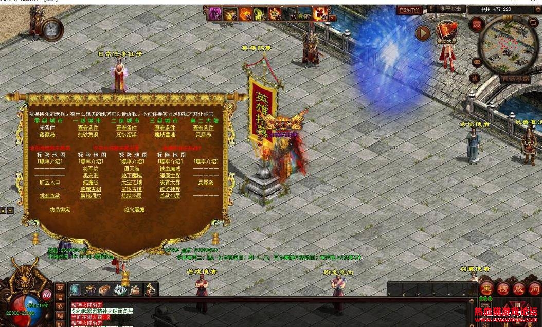 装备系统:装备原则:长久、复古、平衡,以下是《传奇世界》开放的内容,只要耐心所有都会有。大部分的基础技能在各大书店中有售,高级技能只能在游 戏中获得、打到不需要的35级以上书籍可去书店拆卸层书页换取其他书籍。 地图封印:《传奇世界》仅使用了“地图封印”制度, 即:服务器开放若干天内,最高开放的地图和对应的BOSS。 灵兽系统:本服所有BOSS都有几率出灵兽蛋,打到灵兽蛋的勇士可以拿到我这里进行孵化,不仅可以孵化出漂亮的凤凰,更有机会直接获得转生灵兽,勇士们还在犹豫什么,赶紧行动吧!祝你们好运!